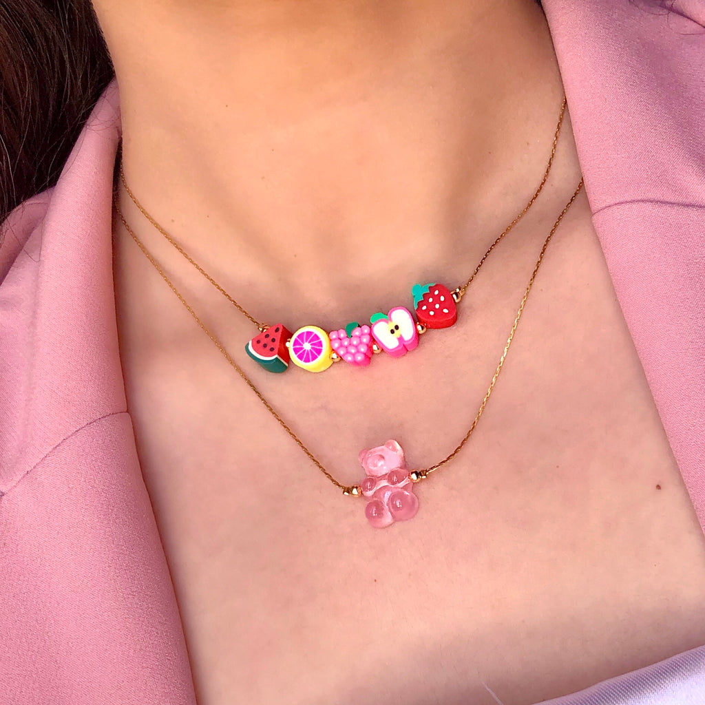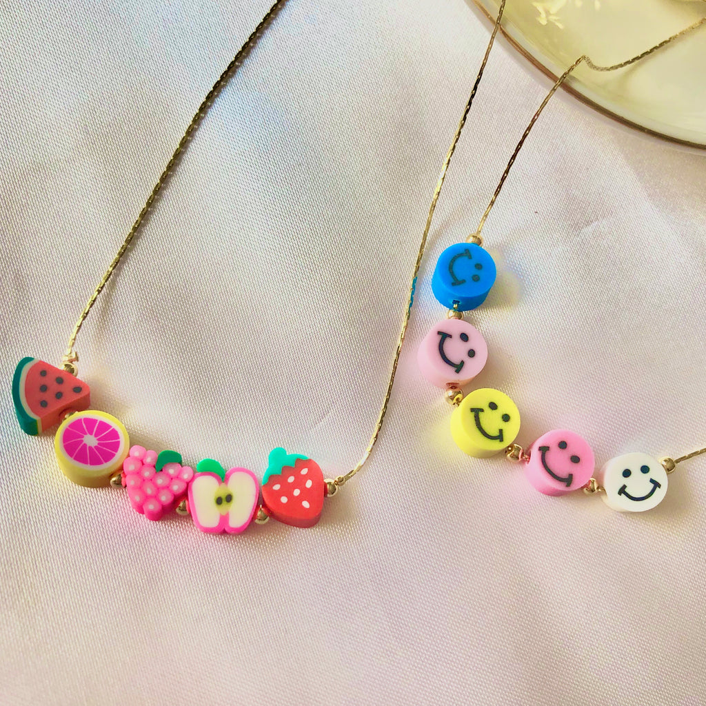 Dijes: Fimo con bolitas doradas en chapa de oro.